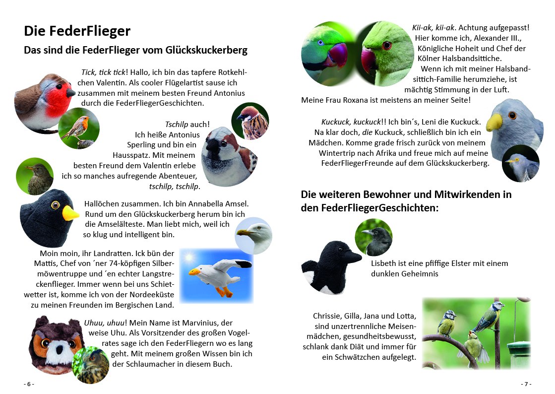 Die lustigsten und listigsten Vögel wohnen natürlich im schönsten Garten der Welt, auf dem Glückskuckerberg. Hier erleben die FederFlieger tolle Geschichten, fröhliche und witzige, welche zum Nachdenken und solche, bei denen man etwas über die Natur lernen kann